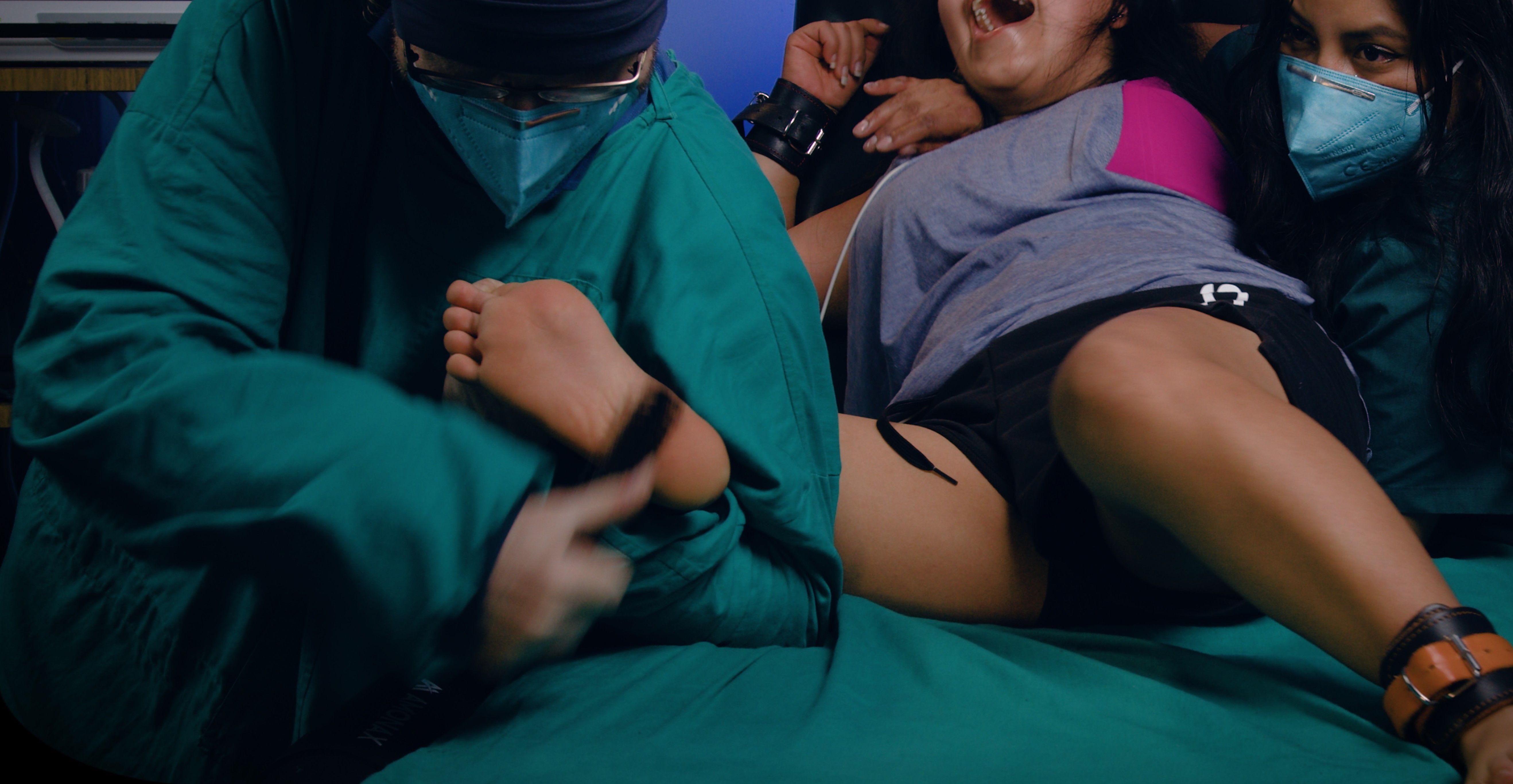 Azucena pleads "Not the feet, please spare them..."—until fingers hit her soles and her pleas dissolve into uncontrollable, endless hysterical laughter.