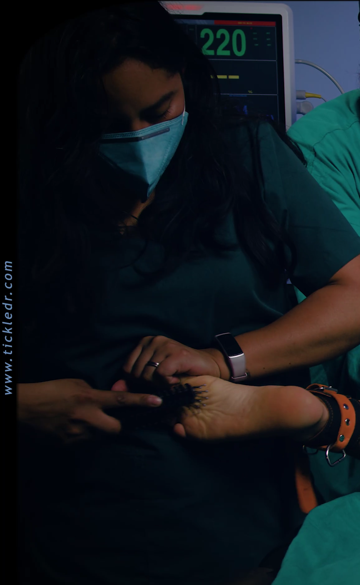 Jane the tickler slowly drags the brush across Azucena's sole—no acting, no exaggeration.